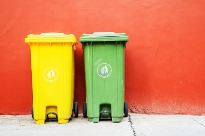 Големи зелени и жълти кошчета с колела з...