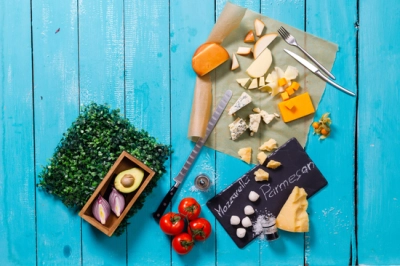 Различни видове сирене върху синя дървен...