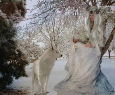 Lobo con mujer vestida de blanco en invierno - 5×5