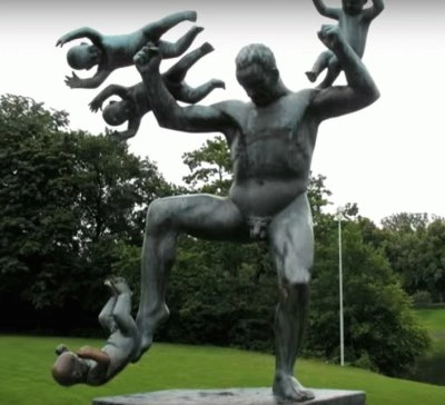 Sculpture of Man balancing babies