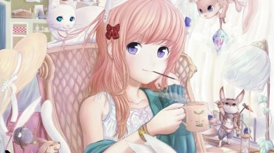 Chica animé tomando el té con conejo y gatos - Pause