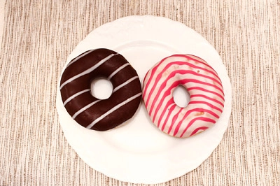 | Rosa und braun gestreifte Donuts auf Teller auf grauem fa - 25 Teile | |||||