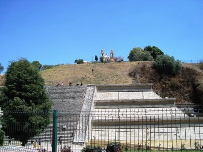 Templo y pirámide en Cholula, Puebla.