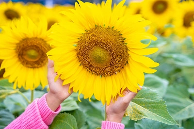 Hands holding sunflower in field. Selective focus - 25 Pieces