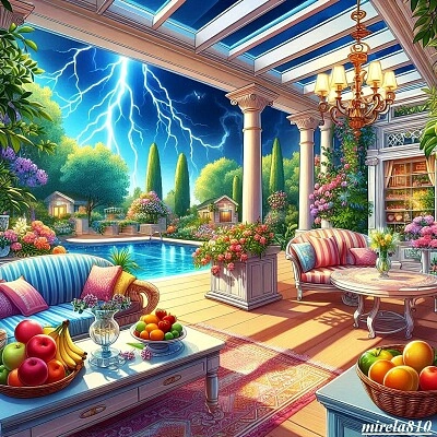interior, house veranda garden storm pool evening