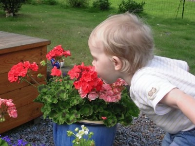 Toddler sniffing the flowers, Sweden