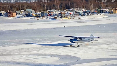 Ski landing on lake-2 blue plane