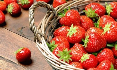 Fresas frescas de color rojo brillante en una canasta de madera o fresa