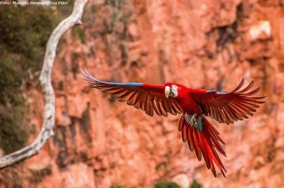 Ara volant, végétation verte en arrière-plan Ara