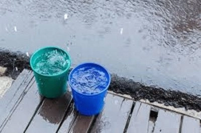 Seaux en plastique colorés avec de l'eau Seau