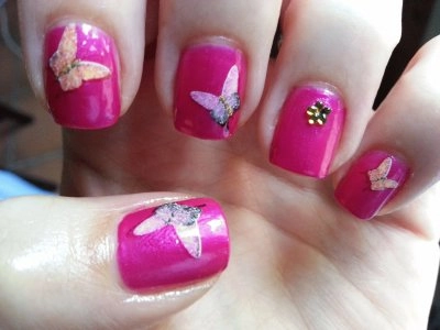 Manucure avec vernis rose et jaune avec fleur Manucure