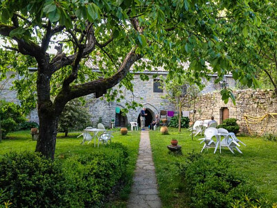 Scène paisible de village avec un chiot parc