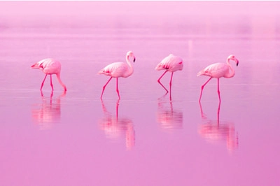 פלמינגו ורודים של ציפורים הולכים על האגם בוורוד - 25 חלקים