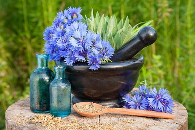 Cornflowers with Mortar and Pestle