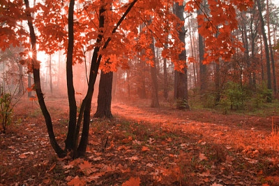 יער סתווי ערפילי עם עלווה אדומה על העצים - 25 חלקים