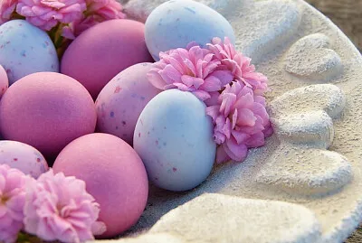 花のチューリップと飾られた卵...