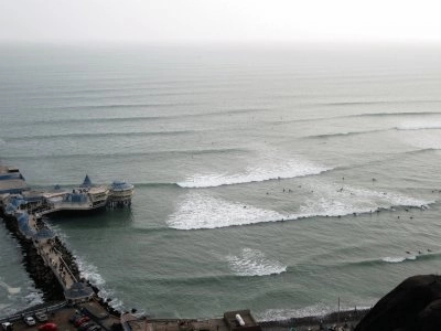 Mar y surfistas en Lima, Perú.