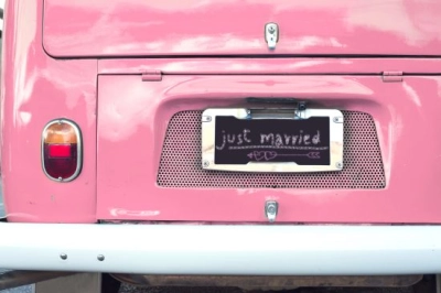 Właśnie żonaty w różowym samochodzie