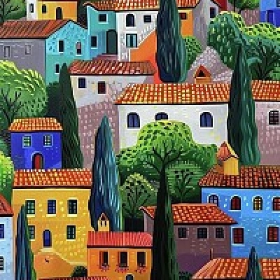 Cartão de felicitações de Feliz 2026 com cena colorida de vila. Vizinhança
