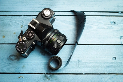 | Câmera de filme antigo e filme antigo em uma caixa de madeira azul - 25 Peças | |||||